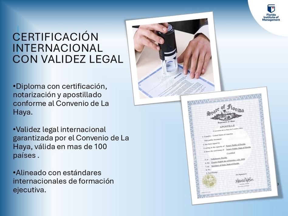 🌍 Certificación internacional con validez legal, notarizada en Florida y apostillada por La Haya